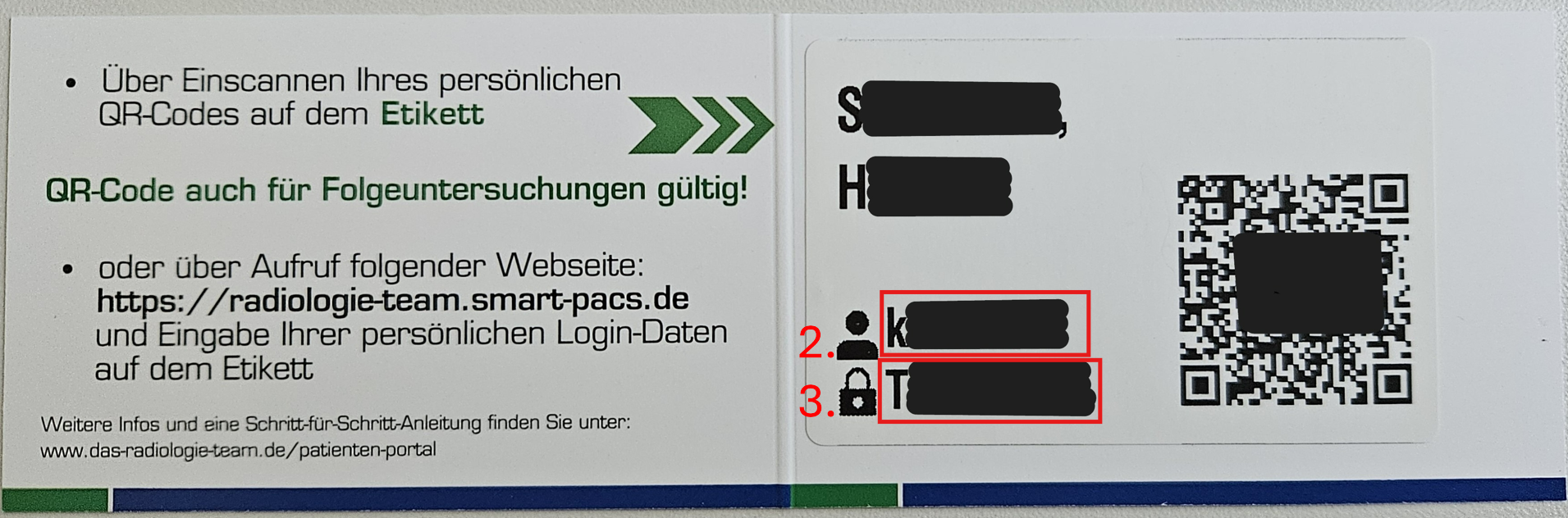 1. Auf der Patientenkarte finden Sie auf der linken Seite (1.) den Link für das Patientenportal. Diesen Link müssen Sie in der Adresszeile Ihres Browser eingeben und mit Enter bestätigen. WICHTIG: Der Link muss genau, wie auf der Karte zu sehen, eingegeben werden = https://rto.smart-pacs.de – Der Aufruf funktioniert nur über den korrekten Link und NICHT über die Google-Suche.