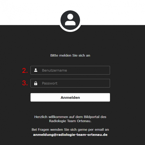 2. Nach Eingabe und Aufruf der Webseite, erscheint die Login-Maske für das Patientenportal. Geben Sie Ihren Benutzer (2.) und das Passwort (3.) in die Felder ein und klicken anschließen auf Anmelden.