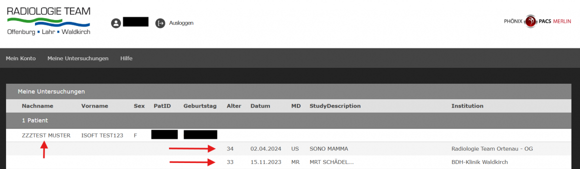 4. Nach der erfolgreichen Anmeldung sehen Sie in der Liste Ihre eigenen Untersuchungen. Per Mausklick auf die jeweilige Untersuchung öffnet sich der Merlin-Viewer bzw. Ihr Befund und die Bilder.